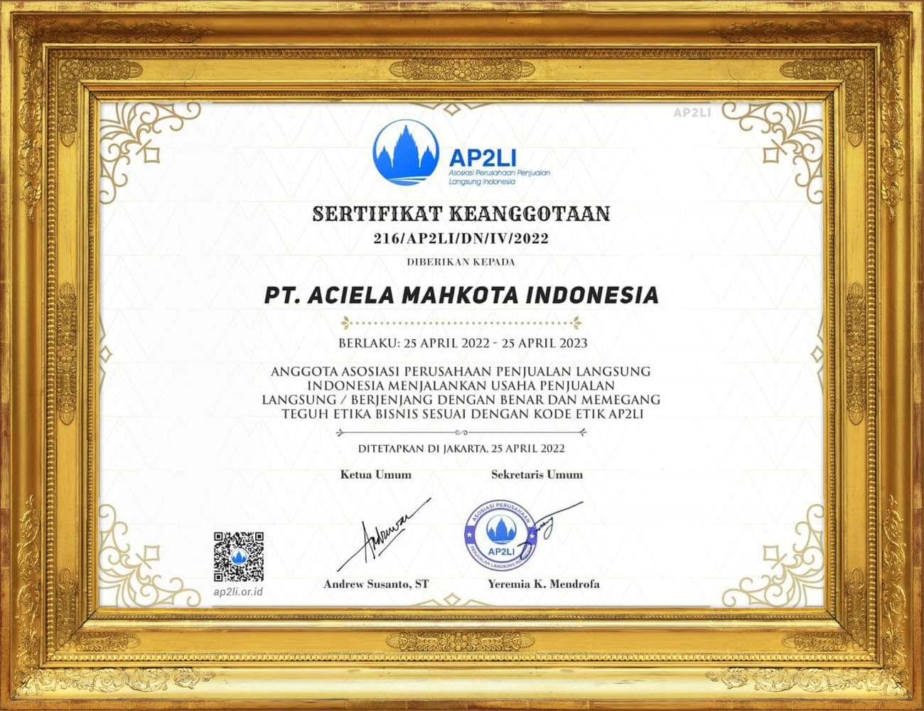 PT ACIELA MAHKOTA INDONESIA adalah perusahaan penjualan langsung dengan sistem jaringan yang diatur dan tergabung dalam AP2LI. Kami berkomitmen untuk menyediakan produk dengan kualitas terbaik buatan Anak Bangsa dan telah sesuai dengan BPOM.